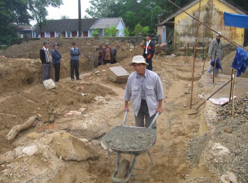Sau khi làm lễ Động thổ, tiến độ thi công Đình làng rất khẩn trương, Nhà thầu xây dựng (nề) tiến hành làm những công việc đầu tiên: như đỗ trụ, làm móng. Nhà thầu mộc đã xong cơ bản phần thô của các kết cấu cột, kèo, đòn tay….