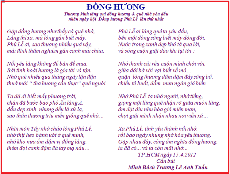 TIN TỨC HỘI Thơ: Đồng Hương Nhân ngày họp đồng hương Làng tại Khu vực TP.HCM lần thứ nhất – Anh Trương Lê Anh Tuấn viết bài thơ đầy cảm xúc tặng Quý Bà con Thư mời Họp mặt Đồng hương làng Phú Lễ Bài sau